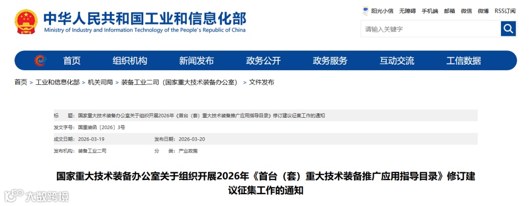 经研究,现组织开展2026年《首台(套)重大技术装备推广应用指导目录》(以下简称《目录》)修订建议征集工作。有关事项通知如下: