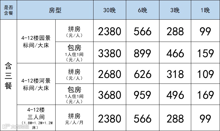 1、此价格包含三餐、水、电、网、床位费、7-10天免费换床品;