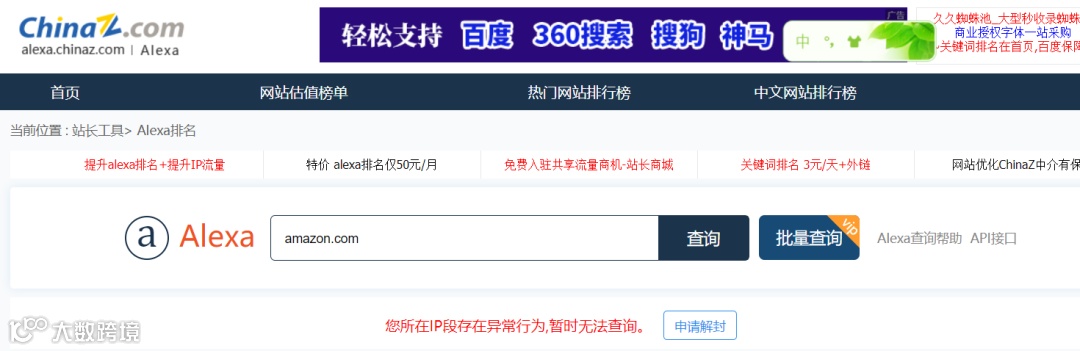 长期研究网站Alexa排名的跨境电商从业者近日发现,曾用于查询网站流量的站长之家出现IP异常提示。转而访问亚马逊旗下Alexa.com时,意外获悉该网站将于2022年正式关闭服务。
