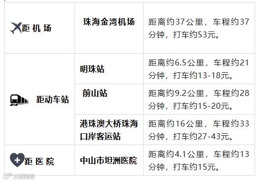 酒店位置在香海高速口旁,可快速通往中深快线。依托珠海、中山成为大湾区物理中点和交通中枢,距离珠西重要枢纽造贝立交方便快捷,经此立交、经金凤快速路,南北连接港珠澳大桥及深中通道,向西则是珠海未来东西主动脉香海大桥,1小时内畅达香港、深圳、澳门等大湾区主要城市,交通便利。