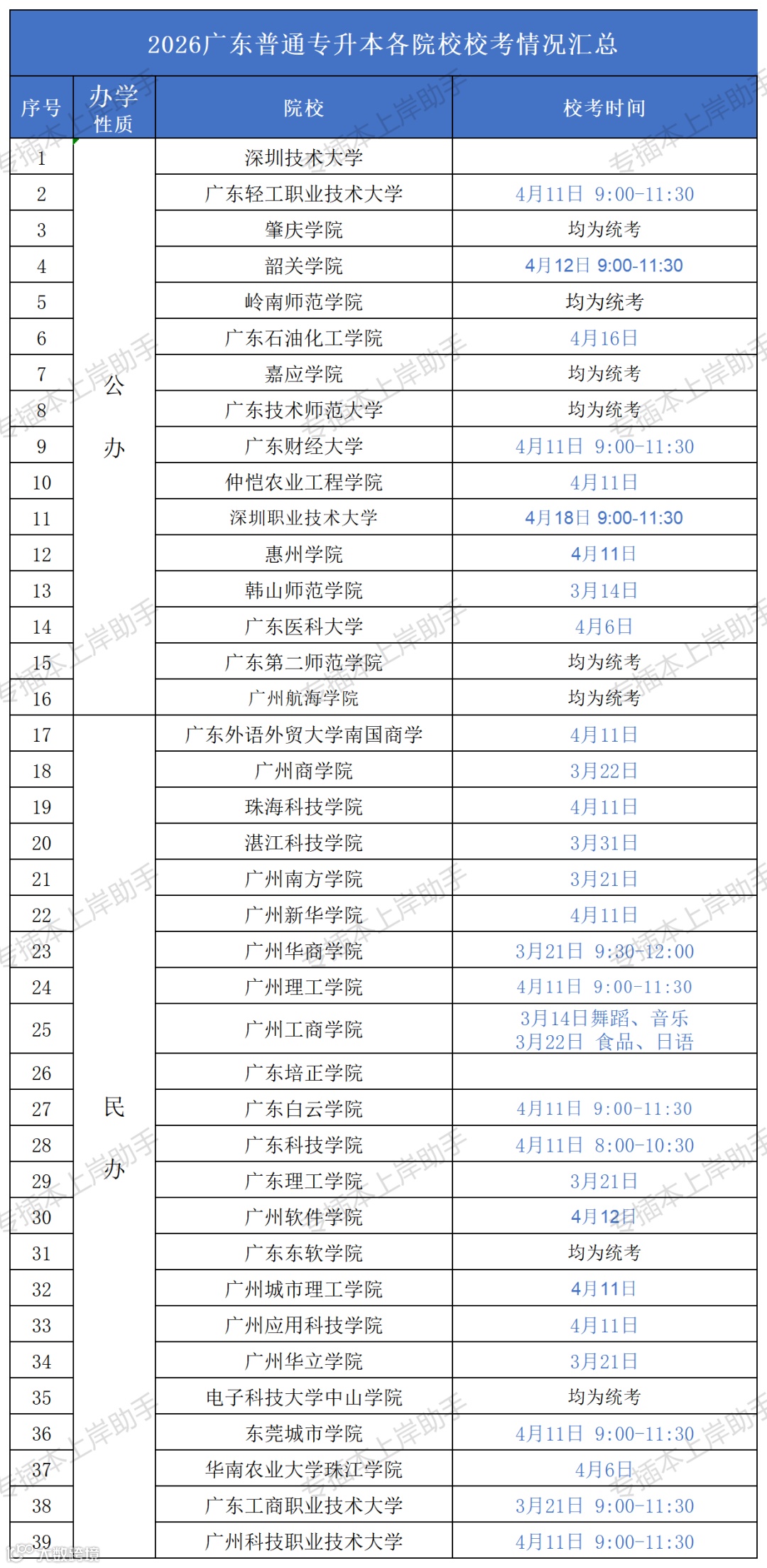2026年广东普通专升考试校考专业综合科目陆续开考,广东理工学院发布了校考准考证打印通知,参加校考的同学就可以开始陆续准备参加各院校组织的校考专业综合的考试了,考试形式大部分是线下闭卷考试,以下为大家汇总完整版的校考开考时间:
