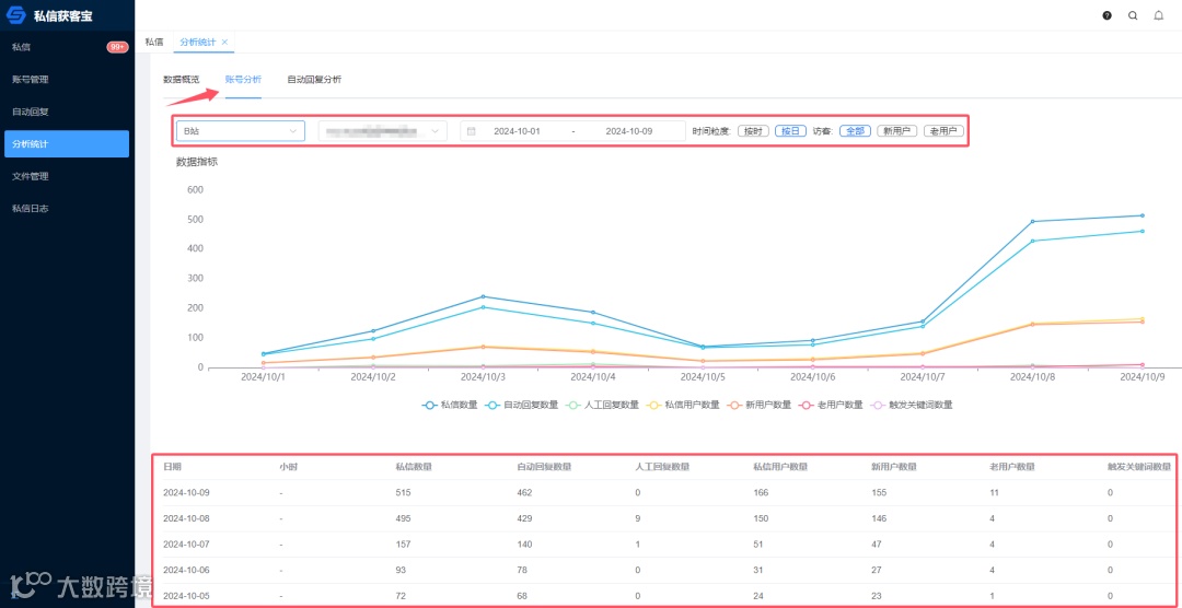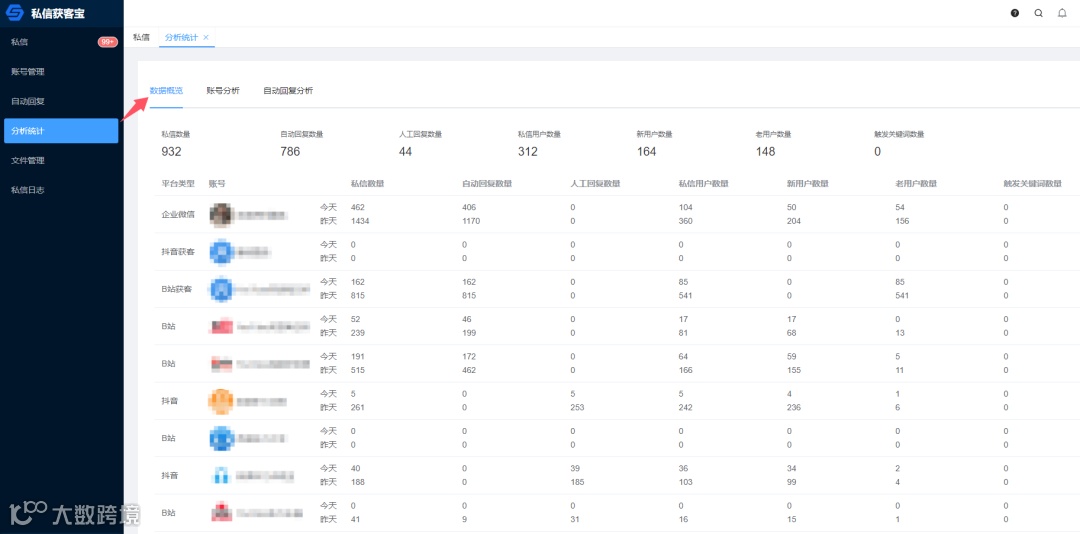 通过「数据概览」,我们可以直观地查看所有平台在最近两天内的私信数量、自动回复数量、人工回复数量、私信用户数量、新用户和老用户数量,以及触发的关键词数量。