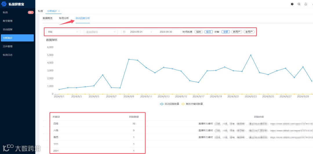 「自动回复分析」功能则帮助用户掌握不同平台账号在指定时间内的自动回复情况,包括数据趋势和关键词使用频率。