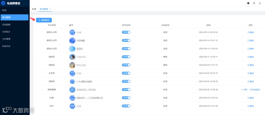 账号管理提供了插件和 API 两种接入方式。安装后,平台账号与私信获客宝账号会在登录后自动关联。而 API 方式则通过扫码授权或 API 配置,实现安全连接。这两种方式不仅简化了账号管理流程,还增强了灵活性与安全性。详细操作可点击“查看授权方式”了解更多。