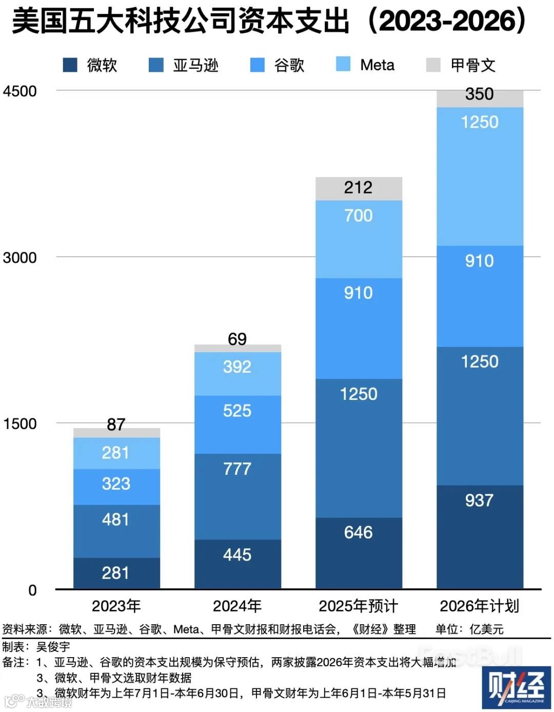 五大科技巨头从 2023 到 2026 年的资本开支预计达到 1.5 万亿美元,其中 2026 年一年就超过 4500 亿,比它们在 AI 时代之前的全部历史投入加起来还多。