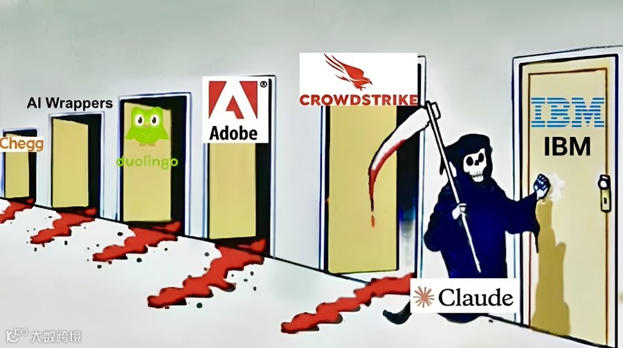 比如整个 2 月份,Claude 的母公司 Anthropic 密集更新了四次 AI 产品。AI 能自动跑企业工作流了,SaaS 软件股崩了;AI 能自动扫描代码漏洞了,网络安全股崩了;AI 能帮银行改写上世纪的老代码了,IBM 单日暴跌 13%,市值一天蒸发 310 亿美元,创下 2000 年互联网泡沫以来的纪录。