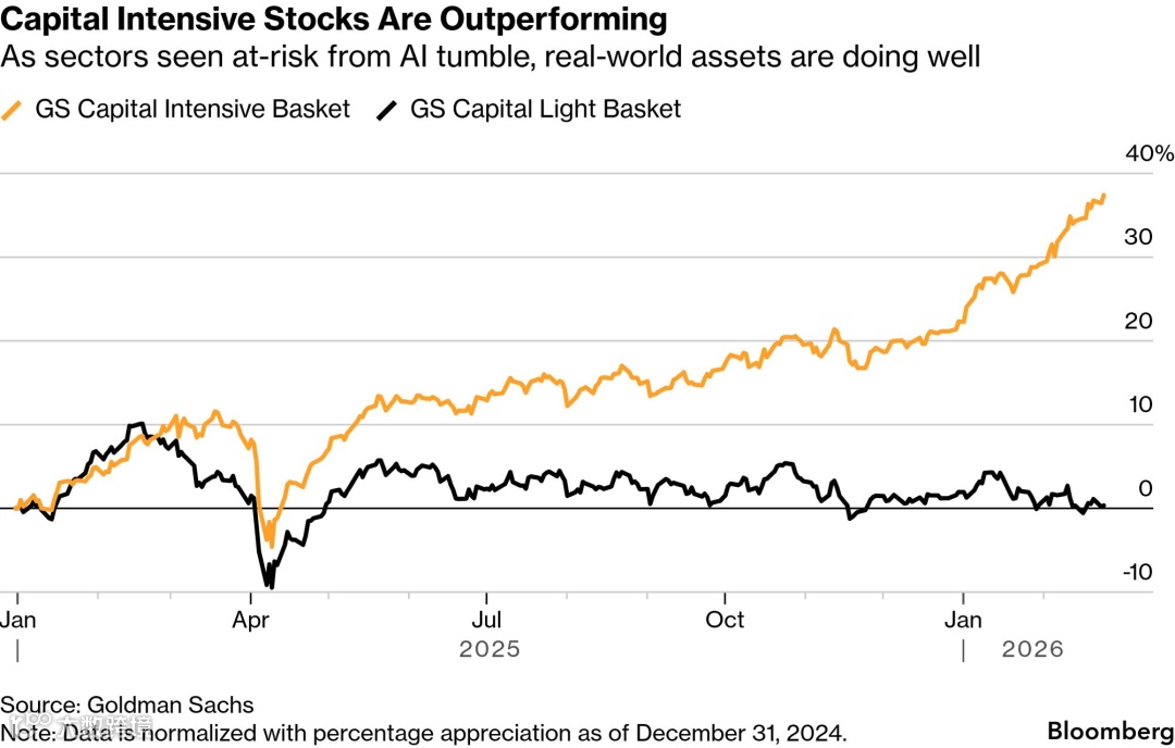 HALO 出现后的几周之内,高盛发了一份正式研报,标题就叫《The HALO Effect》;里面的数据显示,从 2025 年初到现在,高盛持仓的“重资产”股票组合,收益率跑赢“轻资产”组合 35%。