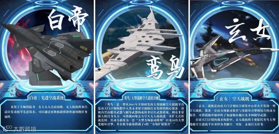 具备大气层内外作战能力的“玄女”无人空天战机;支持有人/无人模式切换、全频段隐身和可变机翼设计的“白帝”空天战机;十万吨级空天母舰“鸾鸟”,它本身并不直接作战,却可以搭载多达88架无人空天战机,构成一个完整的空天作战体系。