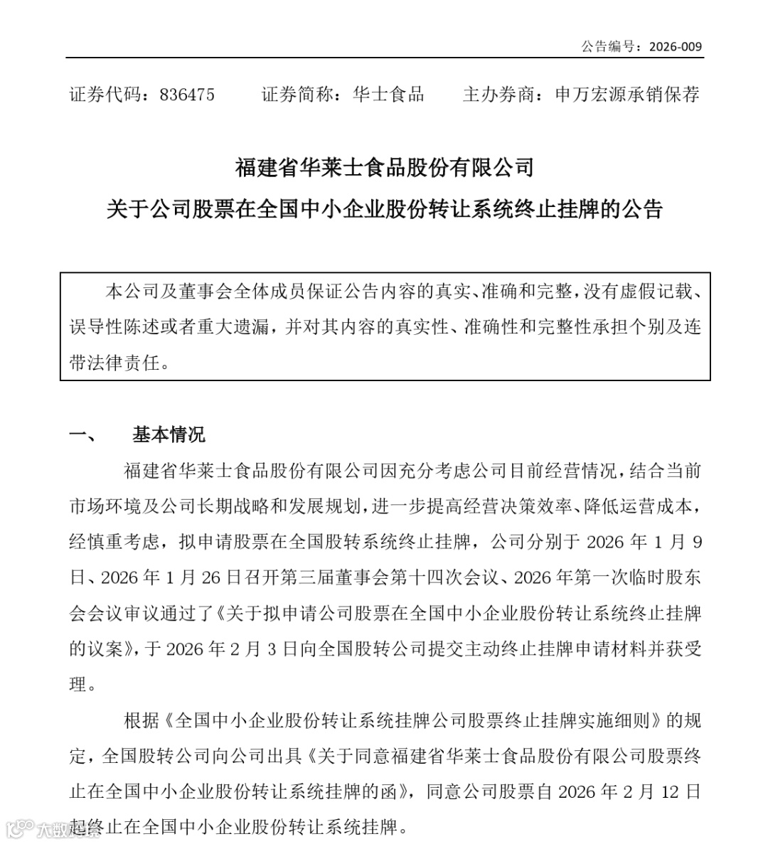 事实上,华士食品退市并非突然。早在今年1月9日,公司就宣布将申请终止挂牌;1月22日,公司股票正式停牌,退市流程随即启动。