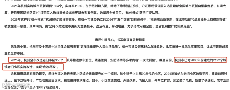 今年1月的一次会议中曾提及:包含2025年的356个小区在内,杭州实施改造的2000年前建成的城镇老旧小区已有2192个。
