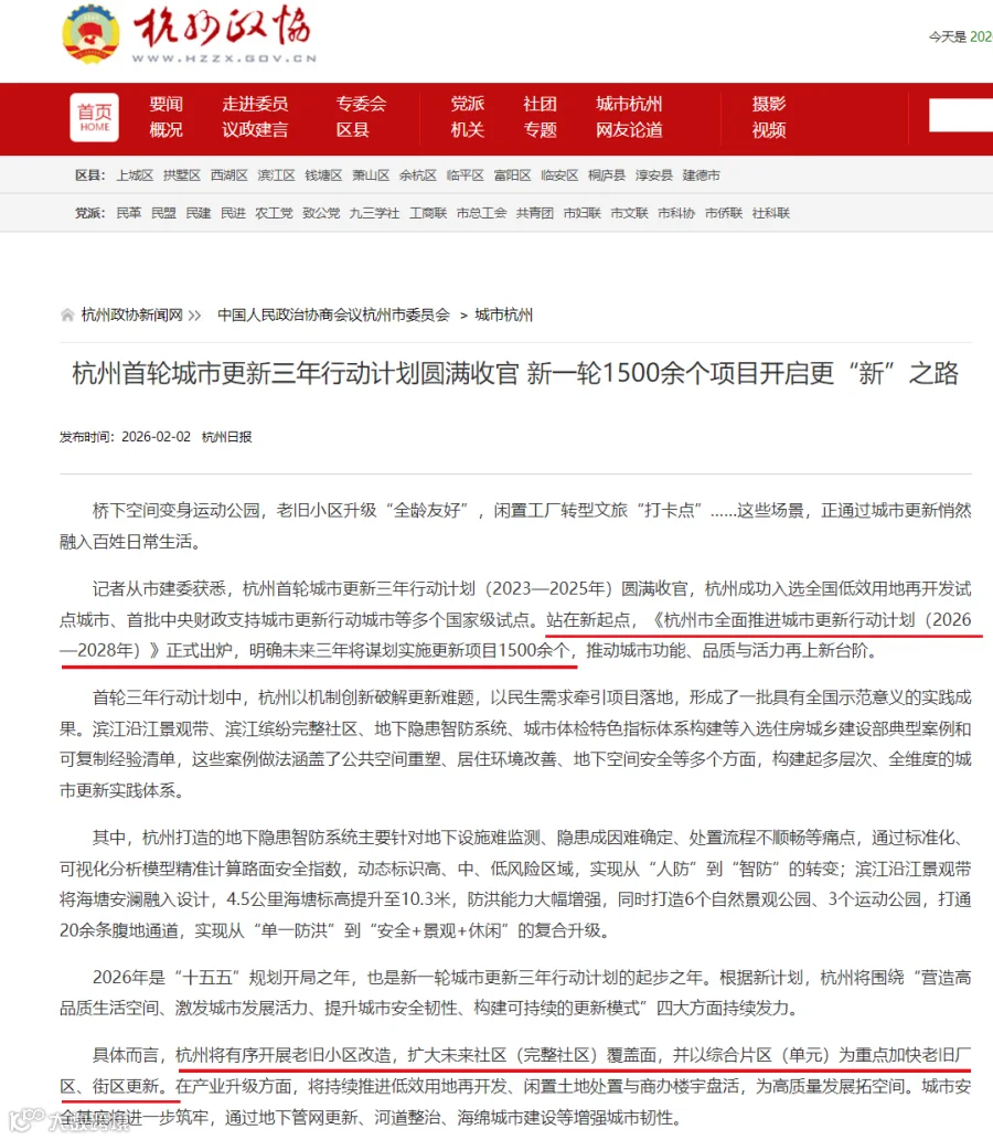 《杭州市全面推进城市更新行动计划(2026-2028年)》明确,未来3年,杭州将实施更新项目约1500余个!