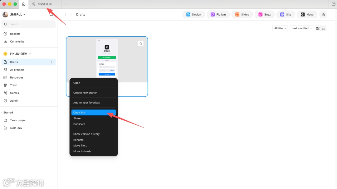 新建一个画板后,在顶部栏或点击这个设计板,复制把链接给到 cc帮你设计 UI。