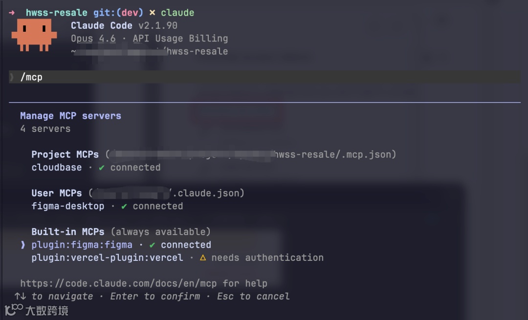配置完成后,最好重启下 CC 终端,然后打开,输入 /mcp 回车,选择 Figma 进行登录授权。