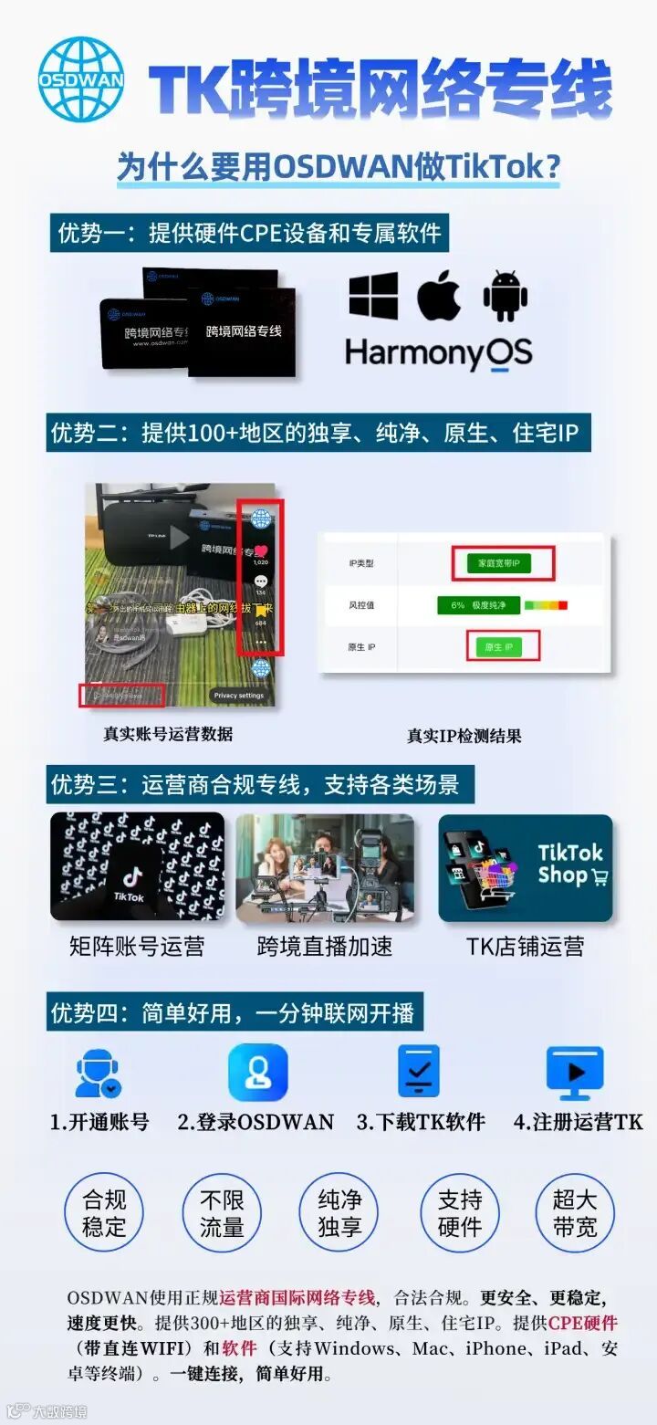 像 OSDWAN 这类跨境网络服务,提供稳定的网络+纯净住宅IP,适用于社媒运营、跨境电商、外贸办公、AI访问等场景。