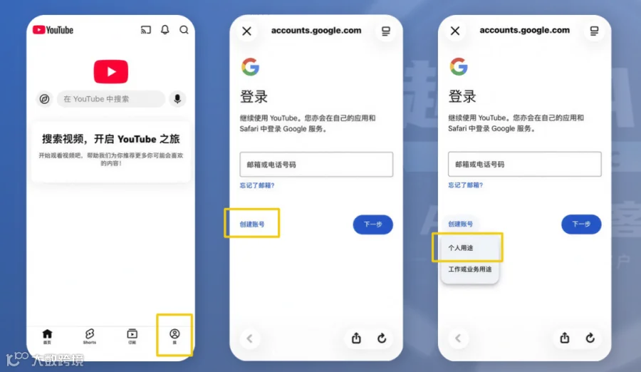 1)打开YouTube应用,点击头像选择【添加账号】→【创建账号】→【个人用途】;
