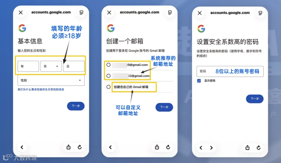 2)填写姓名、生日后,创建专属邮箱地址并设置8位以上密码;