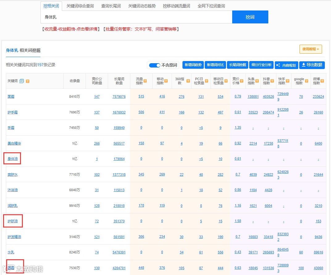 但挖掘出来的有被忽略的“眼霜”、“身体油”“护肤油”等等,与身体乳相关的。这些关键词很难仅凭主观思维想到,但却与用户的需求有关联。所以,可以使用这些相关词来丰富产品描述和标题中。