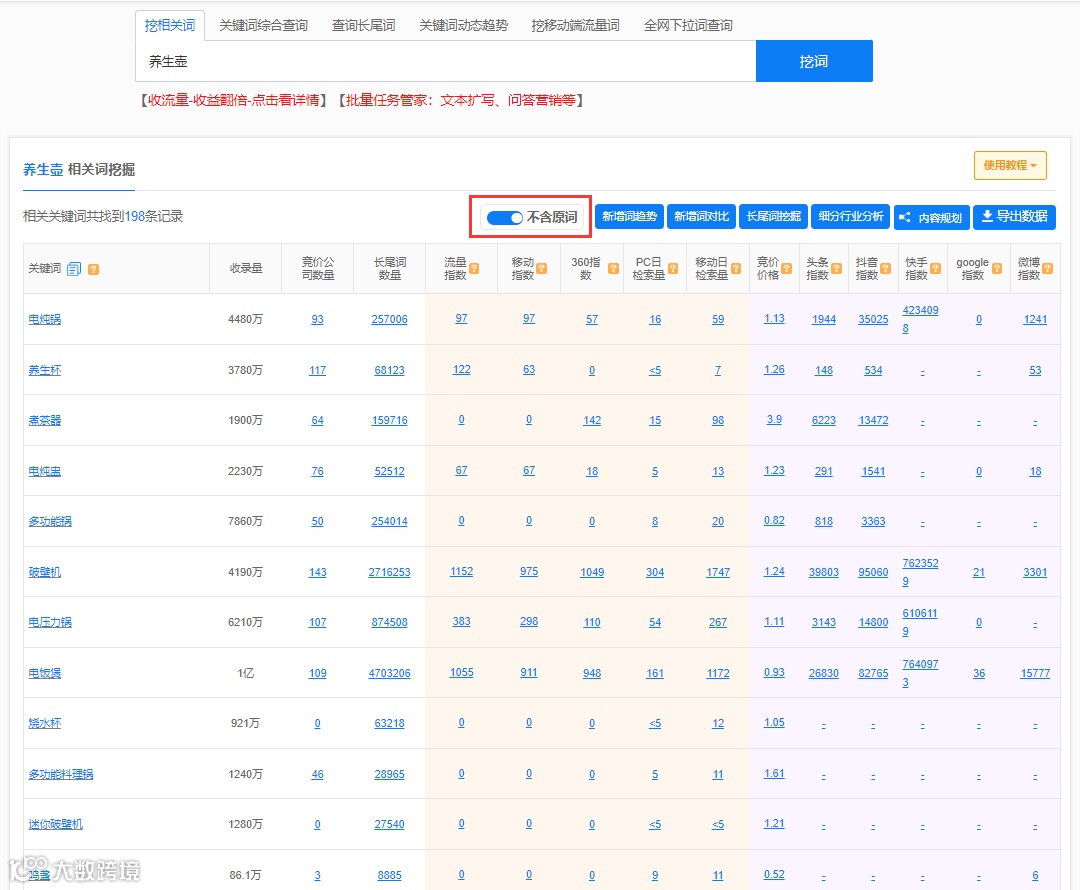 另外,新增的“不含原词”功能可以过滤我们输入的原词,挖掘出更多与原词有关联的关键词。