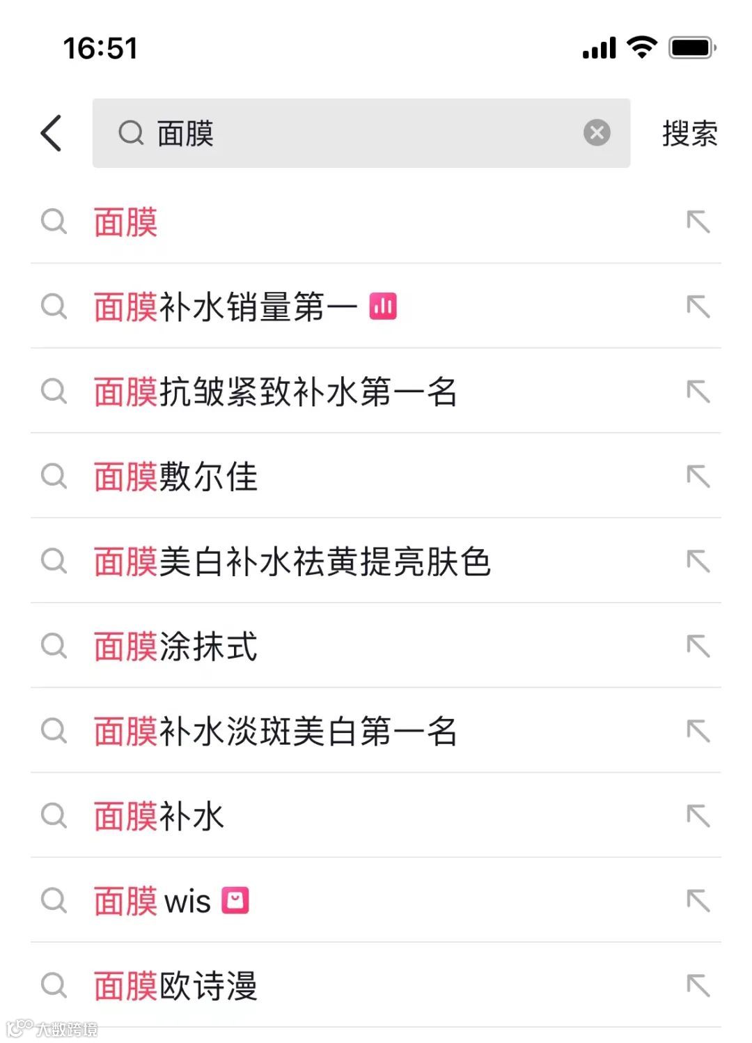 比如,在抖音平台搜索“面膜”,获取到的相关关键词如下: