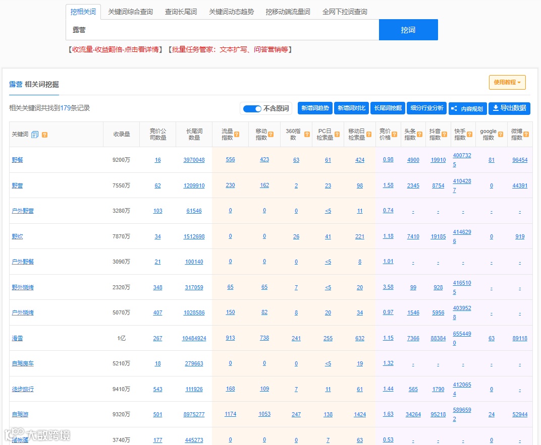 以具体关键词为例,现在很热门的“露营”,搜索到的结果会有:帐篷露营、野餐、露营烧烤以及一些户外活动等更多种相关数据,为用户挖掘出很多有关联的关键词。