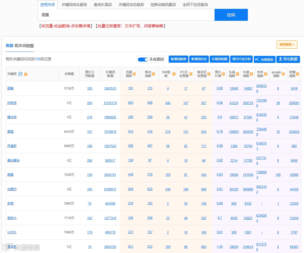 功能结果是与“面膜”有关联的其他关键词,以及在各个平台的流量指数。这些关键词能扩展思路,为产品的营销推广提供参考价值,用来吸引更多潜在客户,并满足他们的需求。