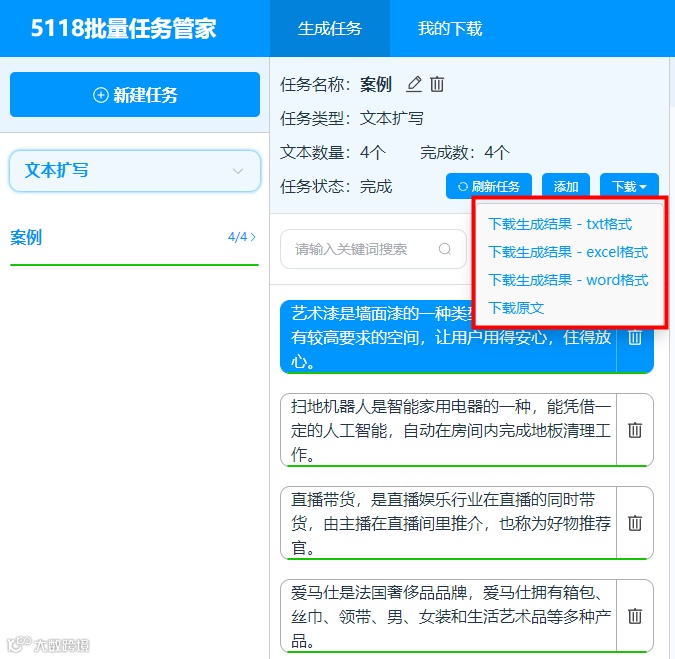 支持下载导出的格式有:txt、word、excel 以及下载原文,同时在任务列表页面可点击任意文本,实时预览生成结果。