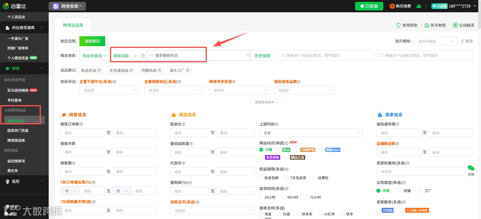 胜利日是俄罗斯最重要的节日之一,相关主题的旗帜、汽车贴纸、纪念胸章、卫国战争风格的T恤等商品流量集中,爆发力强,适合提前布局,可以通过店雷达跨境选品库,输入俄罗斯胜利日等词语,精准匹配具有节日氛围的产品。