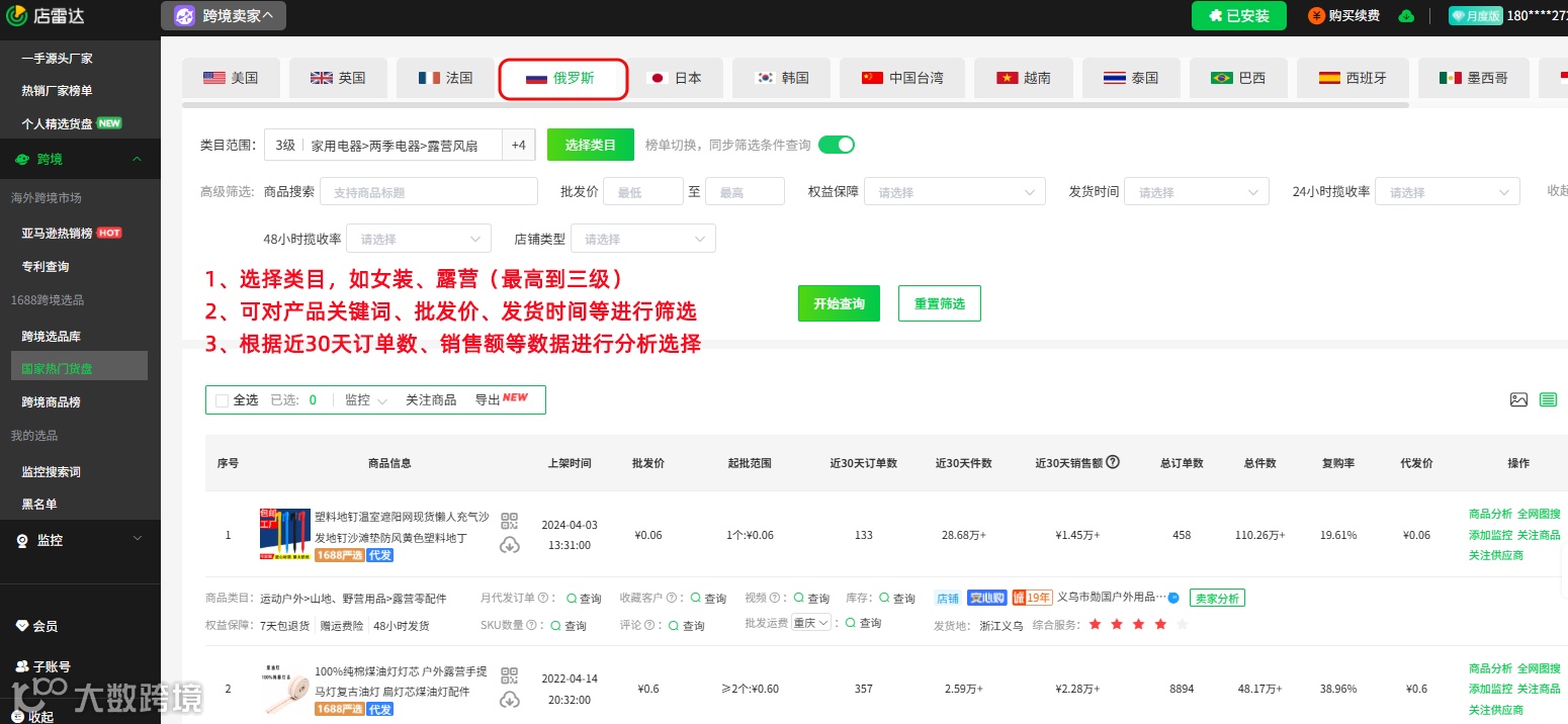 卖家还可以参考店雷达跨境选品工具,在国家热门货盘俄罗斯站点中挖掘符合当地需求的产品,在这里可以找到更多选品方向。