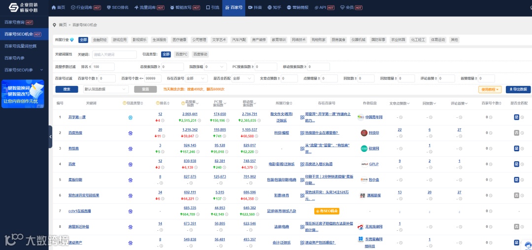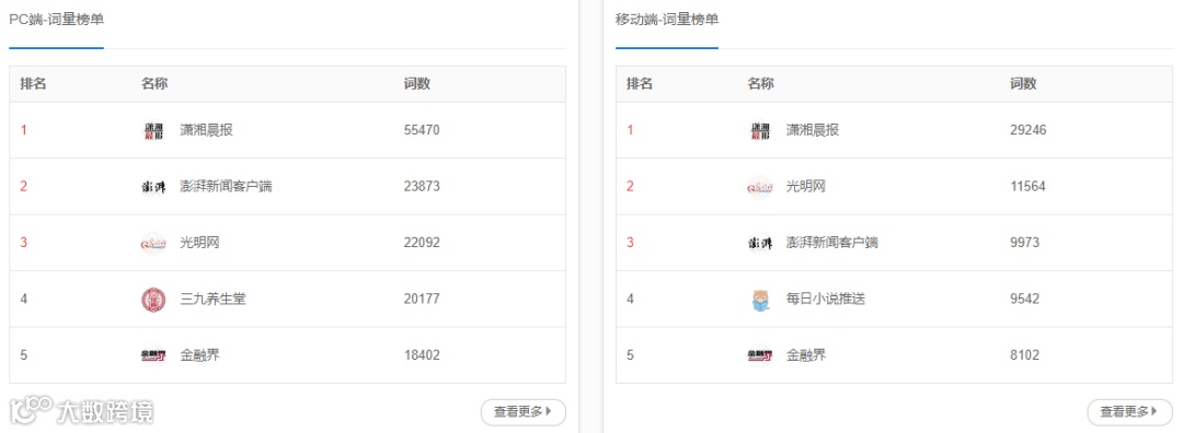 PC端/移动端 词量榜单:该列表列出排名最多的百家号。通过该列表了解哪些公司百家号排名最多,从信息中让我们学习这些公司所做的事情及关键词布局。