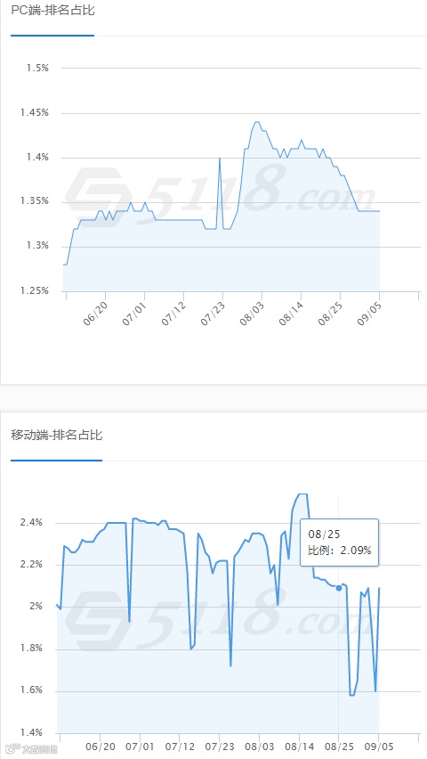 PC端/移动端 排名占比:该趋势图代表在百度PC/移动 搜索结果中,有多少被百家号占据了排名。