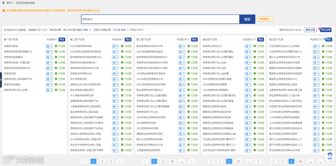 通过「」获得当下最热门的百家号下拉扩展词,系统将根据百家号第一层下拉搜索数据,自动挖掘每一个下拉词的第二层、第三层数据,以此类推,最多可获取到五层的下拉词数据。