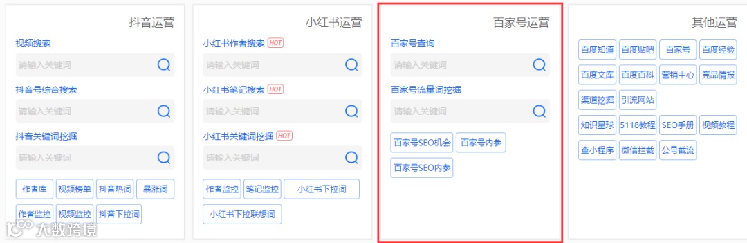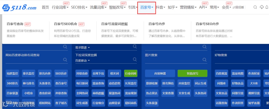 5118菜单栏已开放百家号大数据入口,同时在首页生成快捷查询模块。