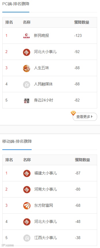 PC端/移动端 排名骤降:该列表列出一天内排名数据跌得最多的百家号。这些百家号往往是近期触犯了某些百度算法,需要引以为戒。