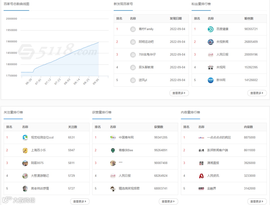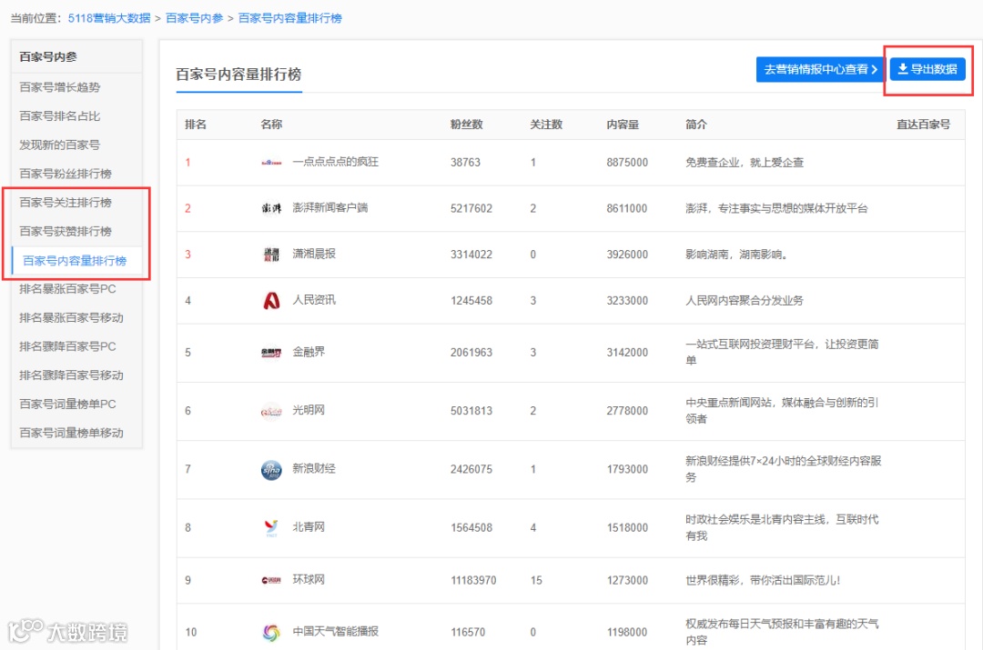 百家号内参页新增:百家号关注排行榜、百家号获赞排行榜、百家号内容量排行榜,以及支持榜单导出数据。