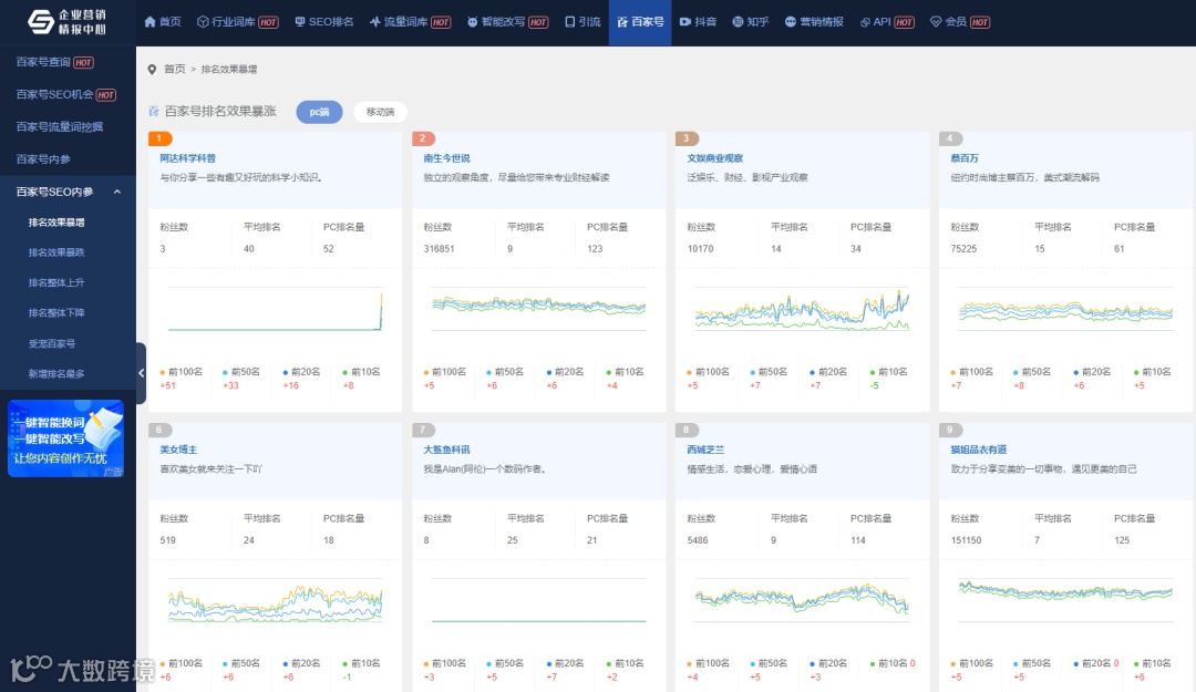 百家号总数曲线图、新发现百家号、粉丝量排行榜、PC端排名 占比/暴涨/骤降 词量榜单、移动端排名 占比/暴涨/骤降 词量榜单。