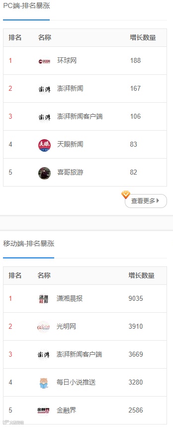 PC端/移动端 排名暴涨:该列表列出一天内排名量突然暴涨的百家号。通过该列表可从中分析百家号突然暴涨的原因,学习其中隐含的排名策略。