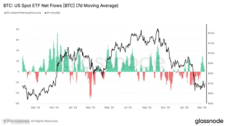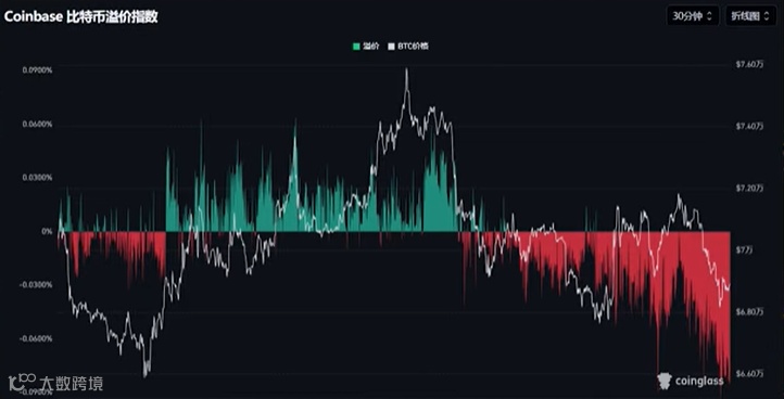与此同时,在近期 72,000 美元的高点,我们没有看到 Coinbase 溢价走高,它始终停留在负溢价区域。随着比特币价格跌破 7 万美元,负溢价程度正在扩大。在昨天周四的交易日中,现货 ETF 呈现流出态势。