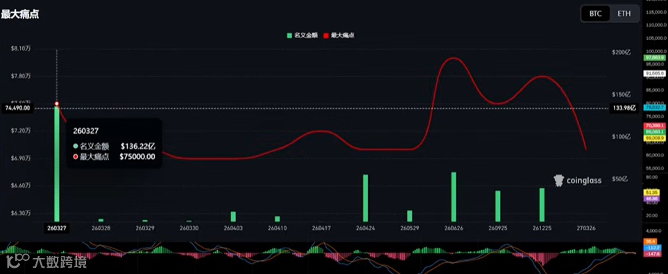 在今天下午 16 点,近 140 亿美元比特币期权,也将会到期交割。最大痛点在 75,000 美元。最近比特币冲到了 72,000 美元,只是到目前为止,4 小时 SMA365 均线还没有确认突破;甚至从今年 1 月份下跌以来,我们就没有看到突破的情况。
