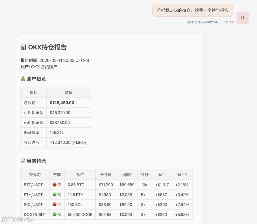 CoinOS原生支持 7 家主流交易所,通过向龙虾下达命令,可以实现7x24小时日常语言驱动的自动盯盘交易: