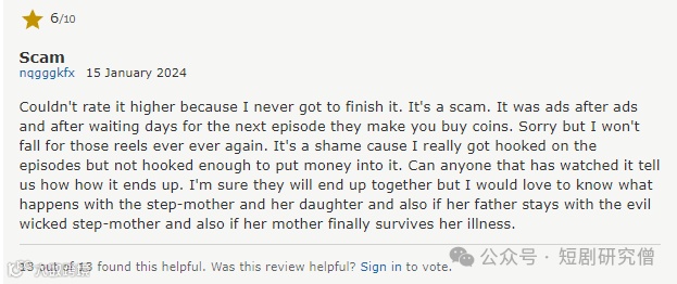 用户普遍反映收费偏高,以Reelshort平均定价计算,一部完整剧集价格可达数十美元。但在内容层面,剧情设计、角色表演获得了较多正面评价。