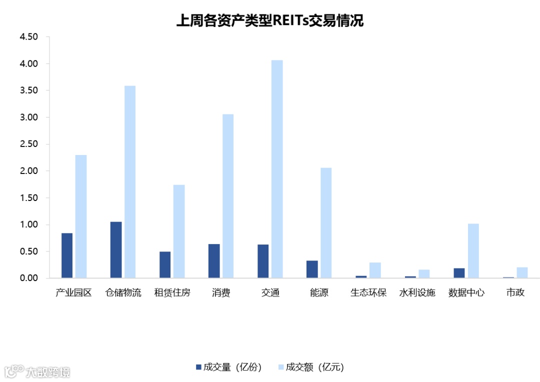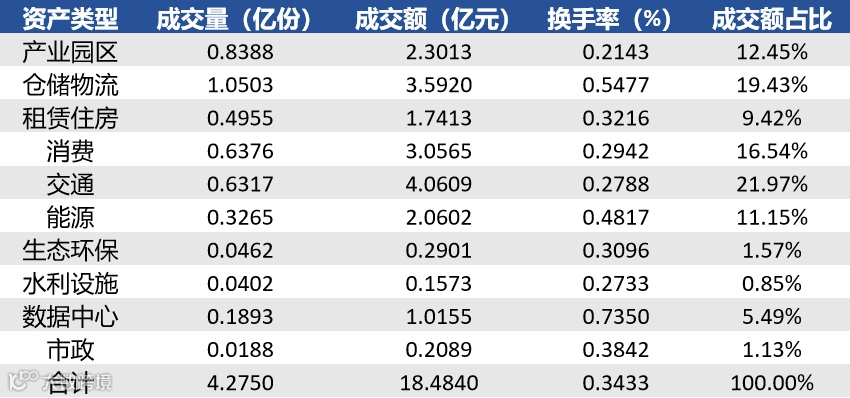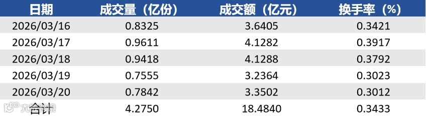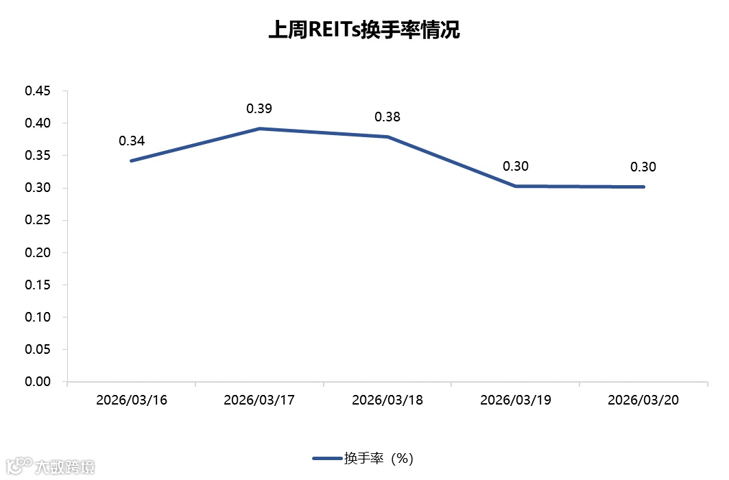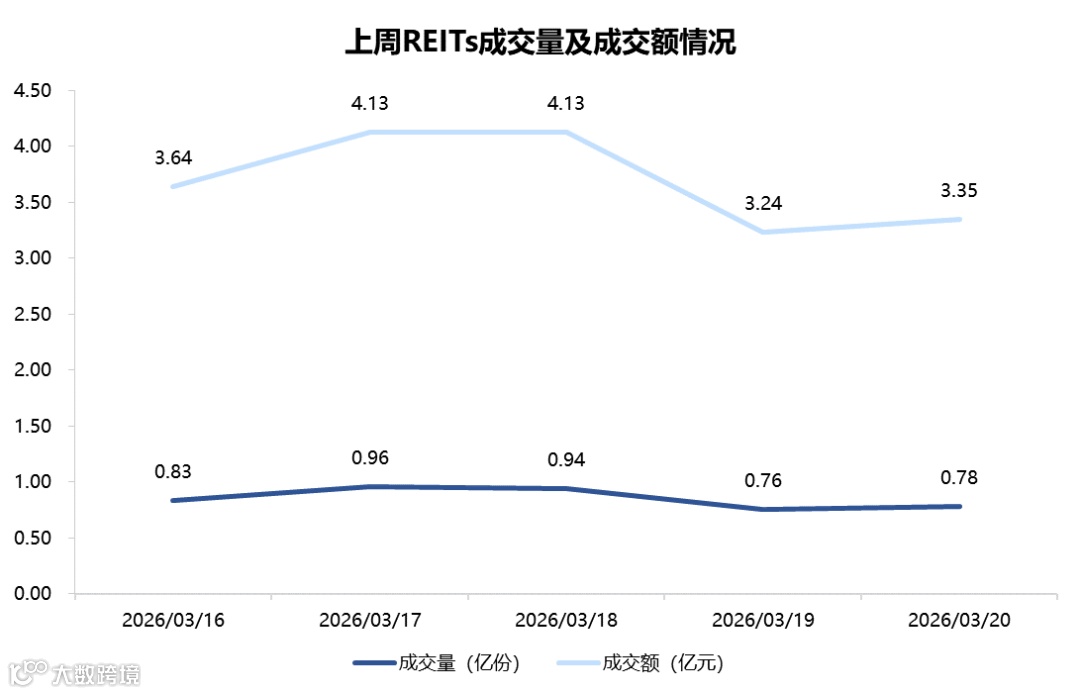 2026年3月16日至2026年3月20日,REITs合计成交量4.2750亿份,成交额18.4840亿元,区间换手率0.3433%。