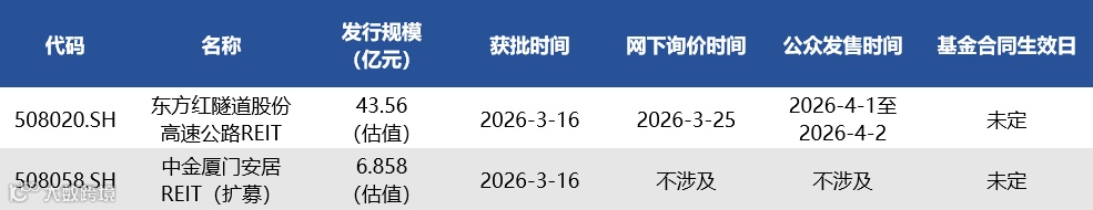 截至3月20日,已获批待上市REITs共有2只(含扩募1只),情况如下表所示: