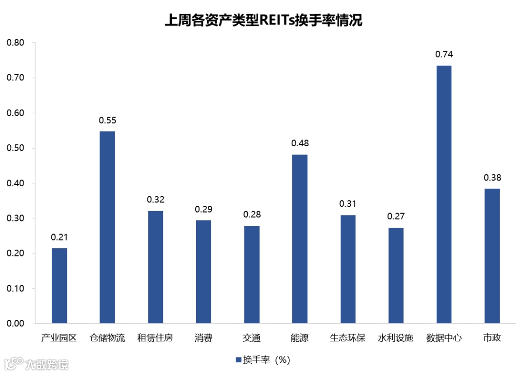 各资产类型方面,上周仓储物流REITs成交量最高,共计1.0503亿份;市政REITs成交量最低,共计0.018亿份。另外在成交额占REITs总成交额比重中,交通REITs(21.97%)排名较高,水利设施REITs(0.85%)排名较低。