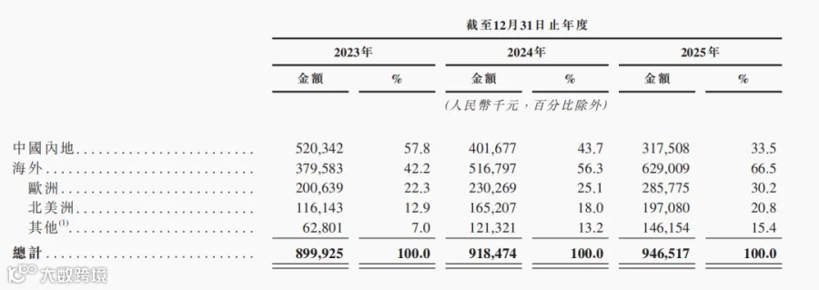 从收入结构来看,海外业务是Aqara绿米的收入“命门”。以其自有品牌计,2023-2025年Aqara绿米海外收入从3.80亿元增至6.29亿元,占比从42.2%升至66.5%,中国内地收入从5.20亿元降至3.18亿元。