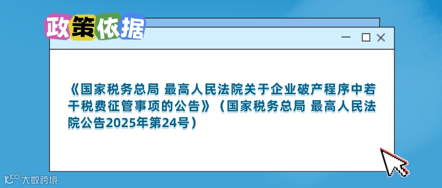11月27日,国家税务总局、最高人民法院联合印发《关于企业破产程序中若干税费征管事项的公告》(国家税务总局 最高人民法院公告2025年第24号,以下简称《公告》),对企业破产程序涉及的税费债权申报、征收管理、新生税费清偿顺位、纳税缴费信用修复等事项予以明确。