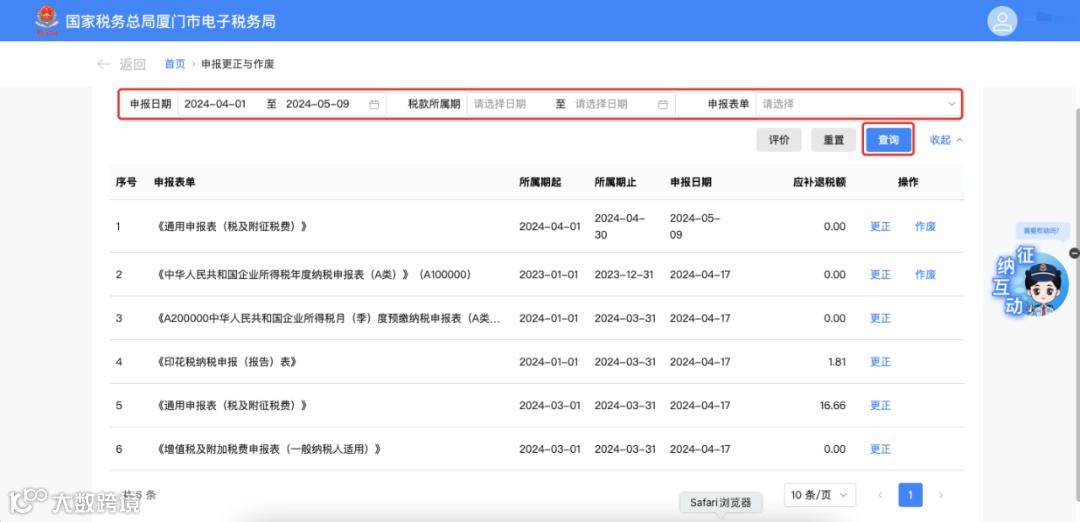 2、进入到页面后,我们可以通过选择申报日期、税款所属期及申报表对已完成申报的申报表信息进行查询。