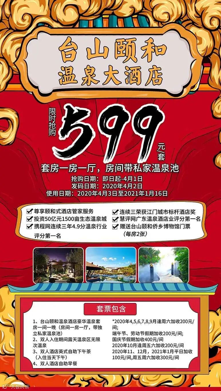 【限时抢购】¥599抢台山颐和温泉大酒店带私家温泉池一房一厅套房,数量有限,售完即止!!