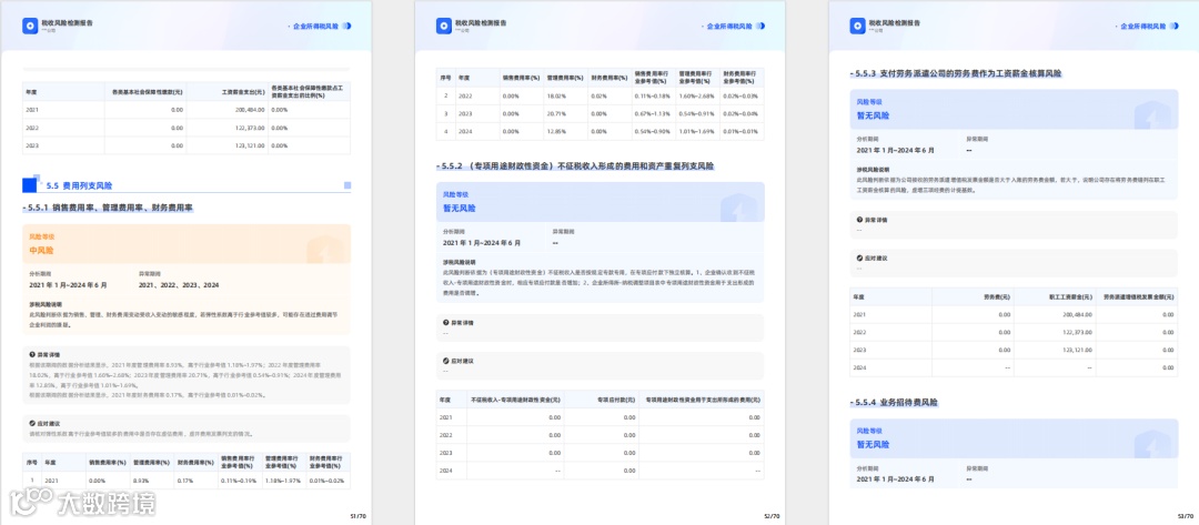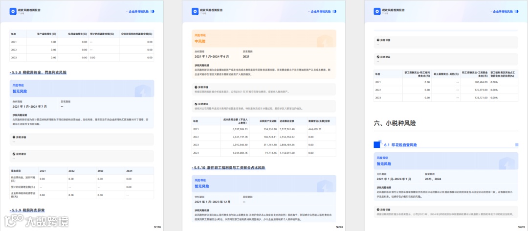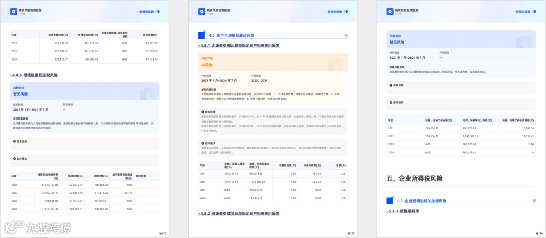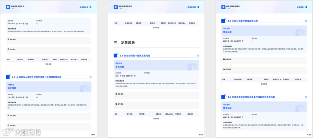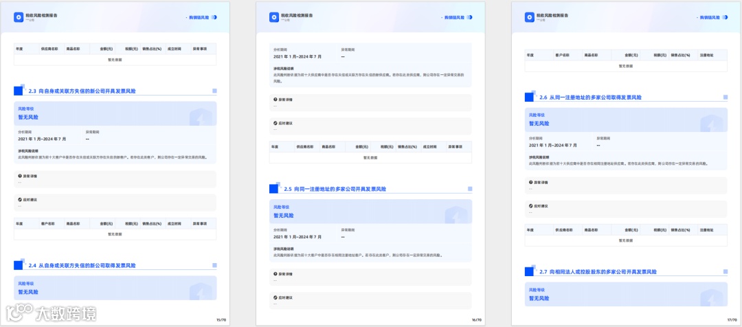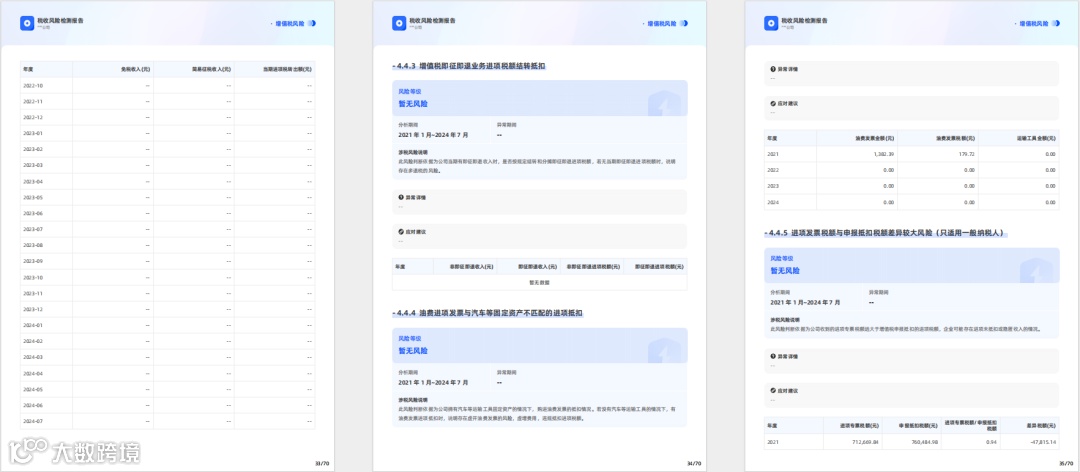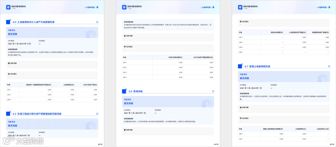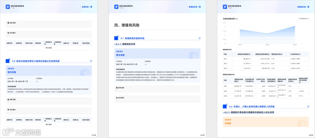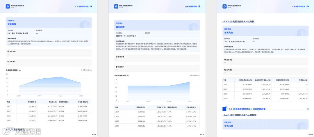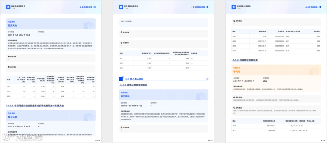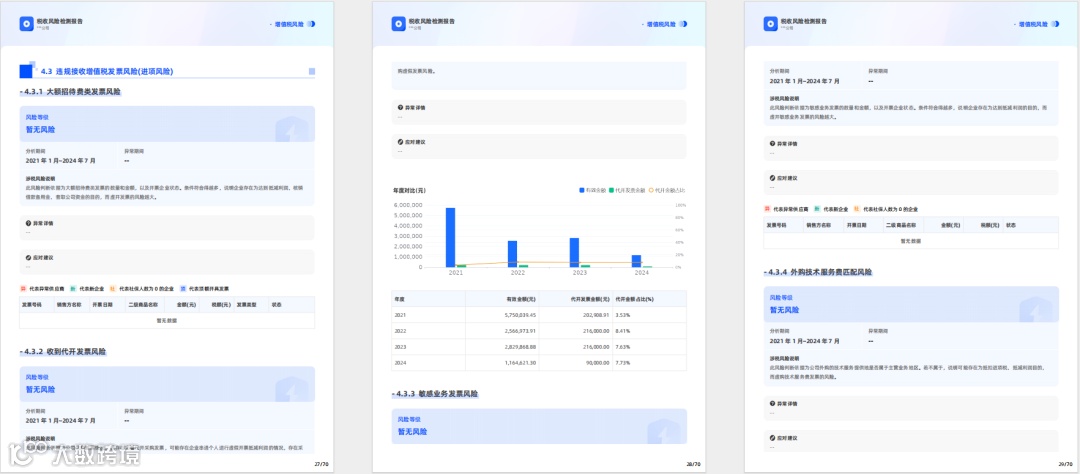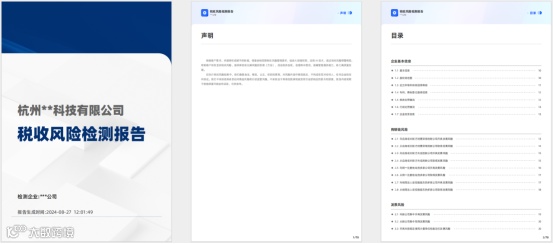 税务风险报告包含 15 大模块系统筛查,覆盖发票、申报、账簿、合同等关键模块,最终出具含风险等级评估和详细解决方案的《税务风险评估报告》,让企业税务状况一目了然。