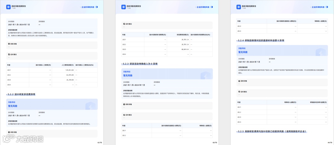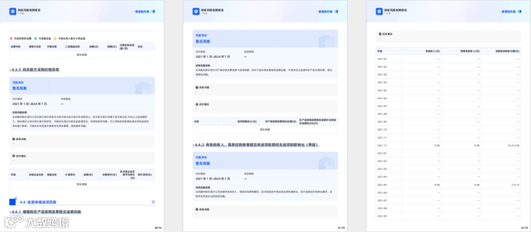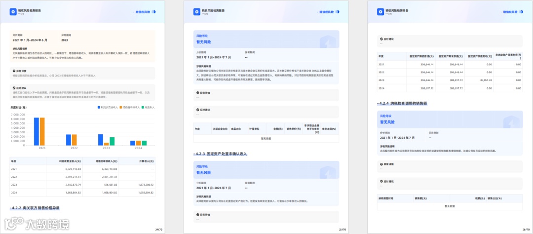 风险检测更是细致入微,购销链风险方面,能察觉关联方异常开票、同一注册地址或相同法人公司间开票风险;发票风险上,可识别向新公司集中开票、不合规填开发票风险。在增值税、企业所得税、小税种等税务领域,依据专业标准和经验,排查如增值税税负率异常、违规享受研发费加计扣除、印花税自查风险等各类风险点,为企业筑牢税务风险防线。
