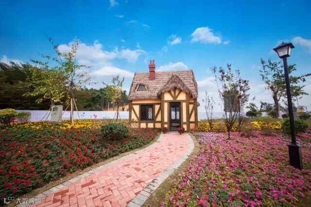 岩石和铁艺的花园大门,散发出优雅清新的英伦味道。植满石竹、葱兰、杜鹃等各色鲜花的英伦花园,适合恋人和孩子在此观赏、拍照等。